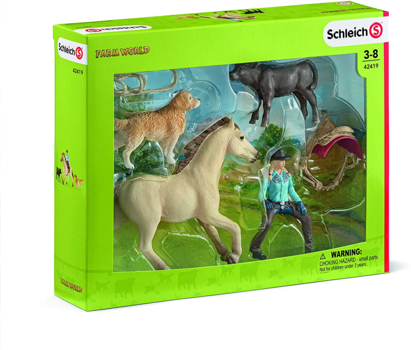 1x Meisje, 1x Quarter Horse Hengst, 1x Black Angus Kalf, 1x Golden Retriever, 1x zadel en hoofdstel.